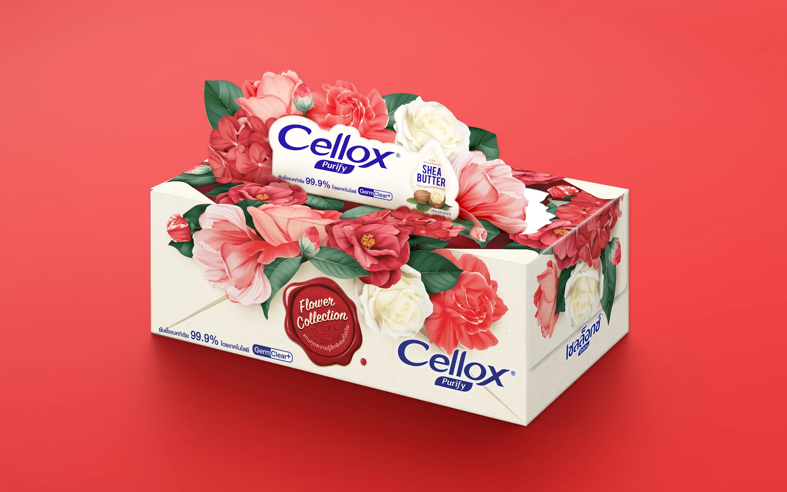 ‘Flower Box’의 발렌타인 한정 패키지 ‘Cellox Purify Flower Valentine Edition’은 시리즈가 추구하는 꽃다발이라는 디자인 컨셉을 이어가면서 흰색 바탕에 화사한 장미와 동백꽃 등 장미와 동백꽃 등을 디자인하여 한 눈에 봐도 특별함을 느낄 수 있도록 했다. 또한 씰링 스탬프를 모티브로 한 아이콘을 인상적으로 배치해 티슈박스를 선물한다는 새로운 가치를 부여했다.