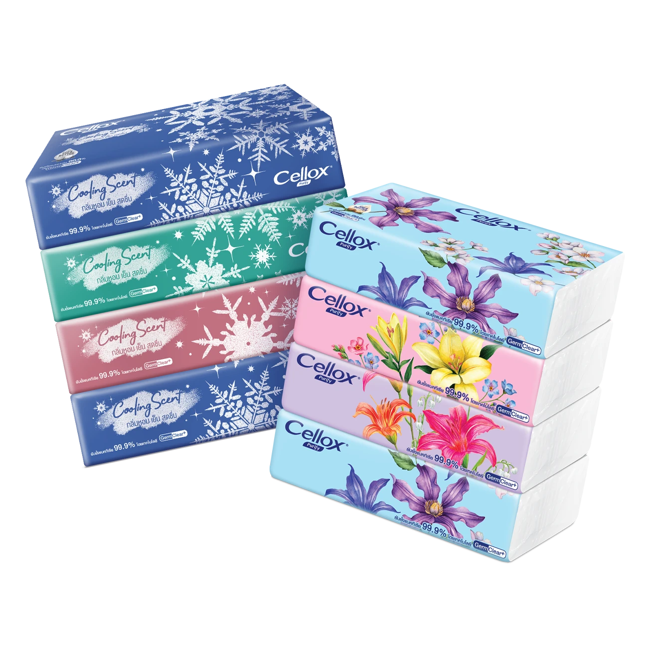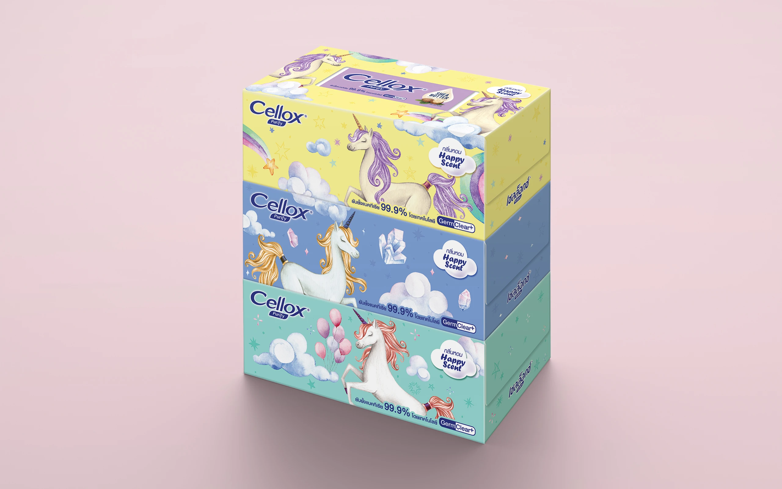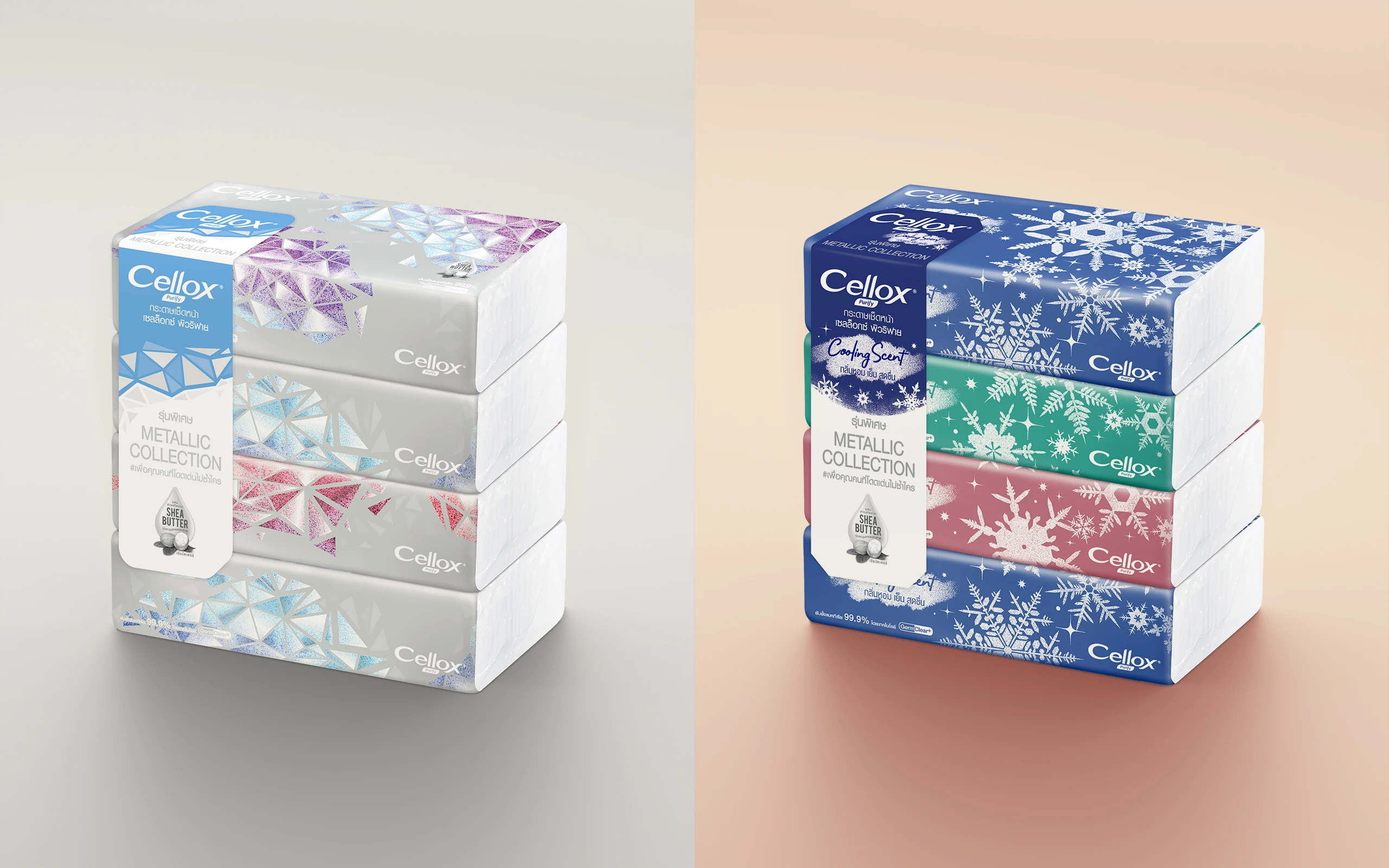 휴대가 간편해 소프트팩 티슈 페이셜 티슈 시장이 급성장하고 있는 태국에서 ‘Cellox facial tissue’는 혁신적인 신제품 개발을 통해 소비자의 주목을 받고 트렌드 리더로서의 입지를 다지는 것이 목표였다. “Cellox Mettalic”은 다이아몬드를 모티브로 한 디자인으로 입체감과 광택감을 표현하고, 태국 트렌드 중 하나인 메탈릭 패키지로 완성했다. 배경에 무늬를 넣어 움직임과 경쾌한 이미지를 더했다. 민트향이 나는 ‘Cellox Mettalic Cooling’은 시원한 사용감을 눈송이로 표현했다. 메탈릭 배경에 크리스탈 부분을 옅게 채색하여 눈의 차가운 느낌을 강조한 디자인이다.