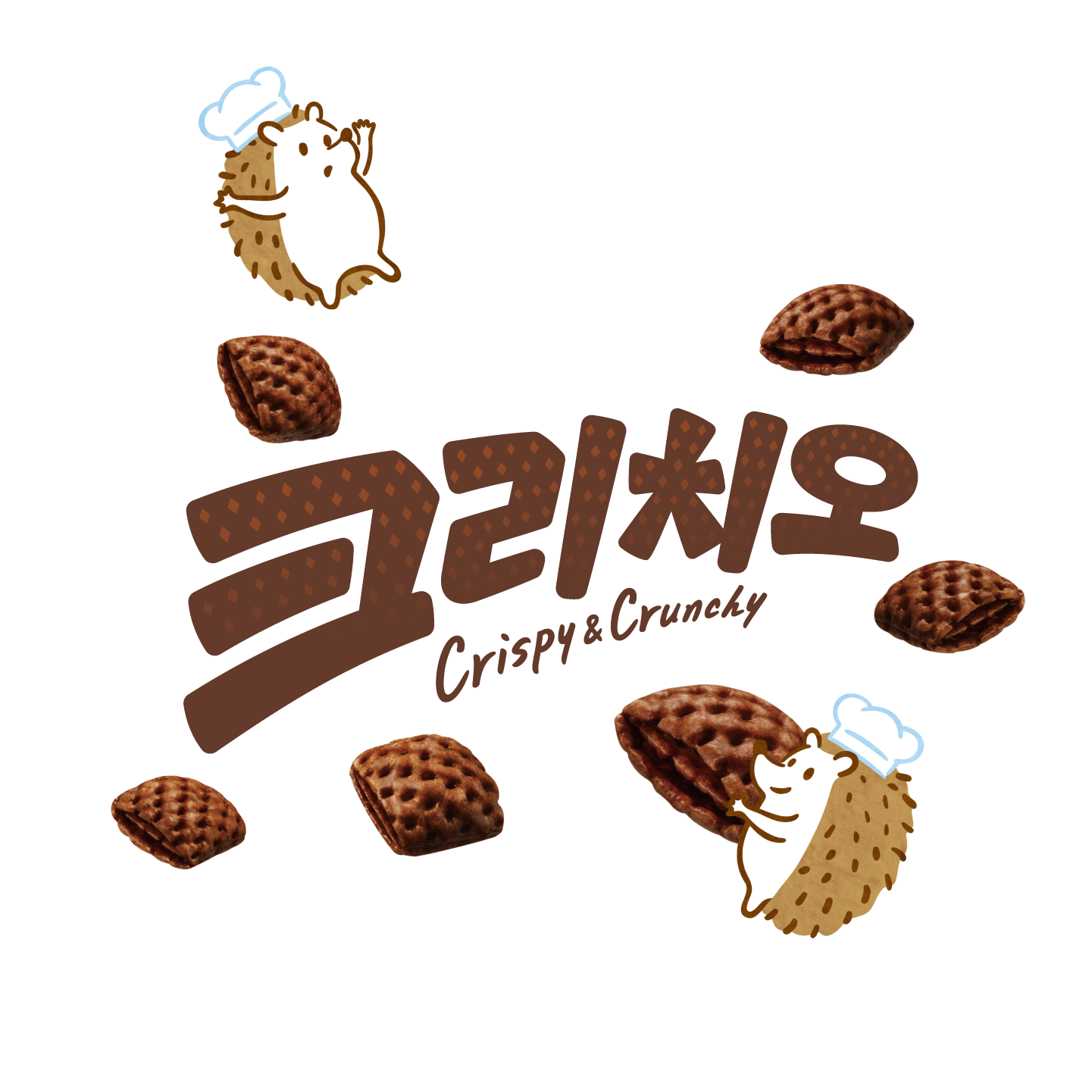 패키지 디자인은 시리얼 보울이 등장하는 뻔한 양식에서 벗어나, 시리얼에 부어지는 우유와 ‘크리치오’라는 한글 로고를 한 세트로 만들었습니다. 로고는 실제 시리얼의 모양처럼 그물 무늬를 넣어 먹음직스럽게 만들고, 튀어오르는 시리얼을 함께 배치했습니다. 셰프 모자를 쓴 고슴 도치 캐릭터가 사랑스러운 패키지이며, 시장에서 좋은 반응을 얻어 뒤이어 쿠키 플레이버도 출시되었습니다.