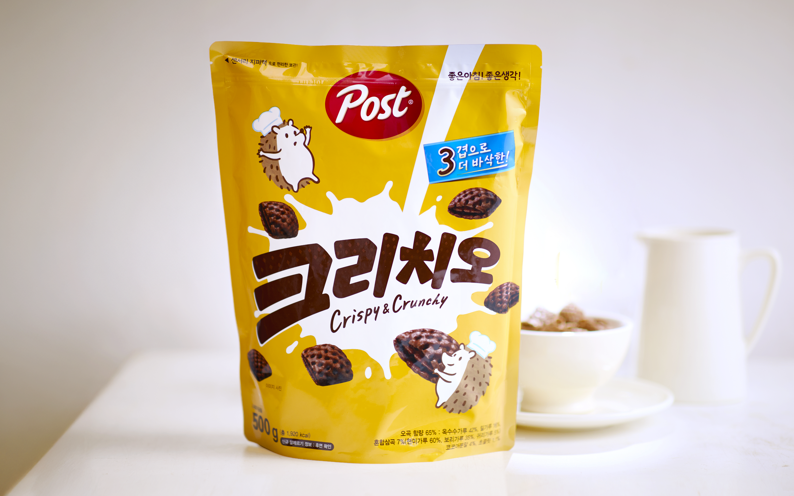 동서식품에서는 시리얼 브랜드 포스트(Post) 신제품 ‘포스트 크리치오’를 출시했습니다. ‘크리치오(Criccio)’라는 제품명은 바삭함을 의미하는 ‘크리스피(Crispy)’와 이탈리아어로 고슴도치를 나타내는 ‘리치오(Riccio)’를 조합한 것입니다. 이 제품은 세 겹 구조로 만들어져 우유와 함께 먹어도 오랫동안 식감을 유지하며, 풍부한 초콜릿 맛을 즐길 수 있습니다. 브라비스에서는 제품 네이밍과 캐릭터 개발, 패키지 디자인에 참여했습니다.