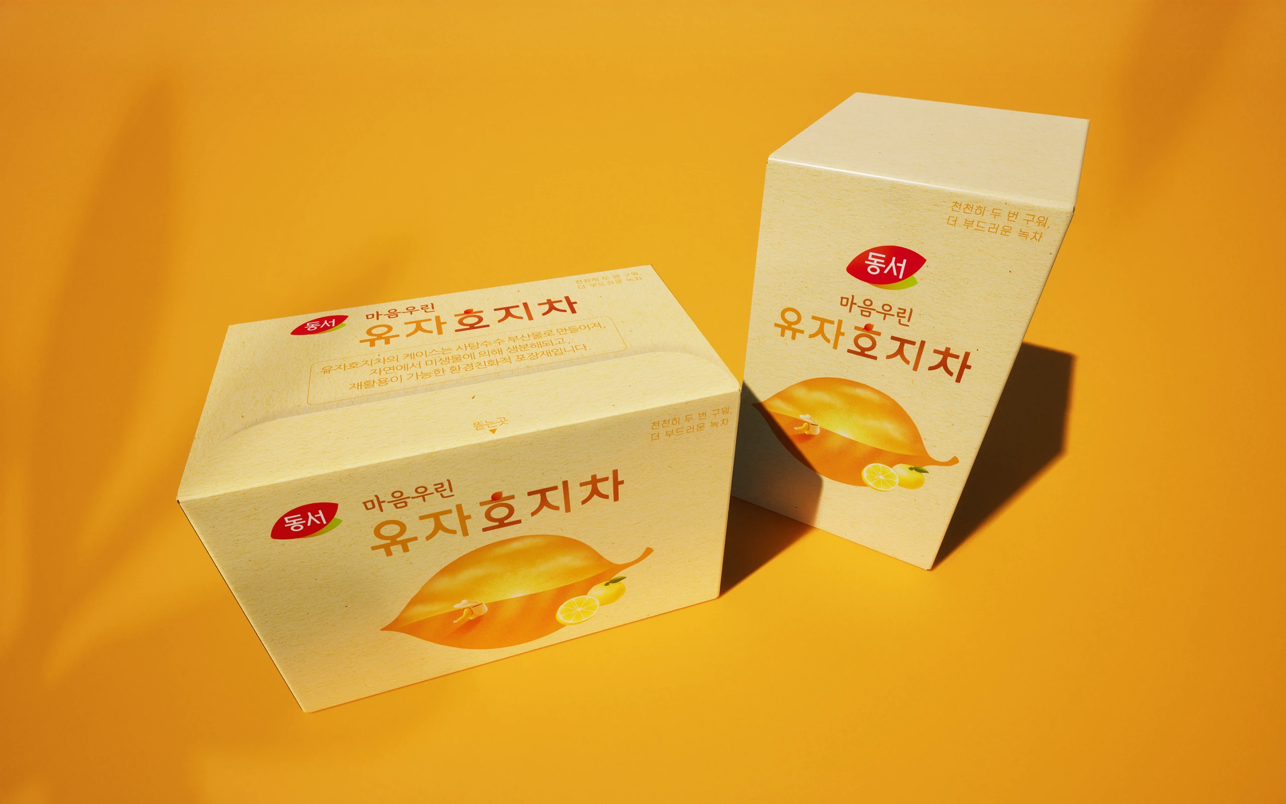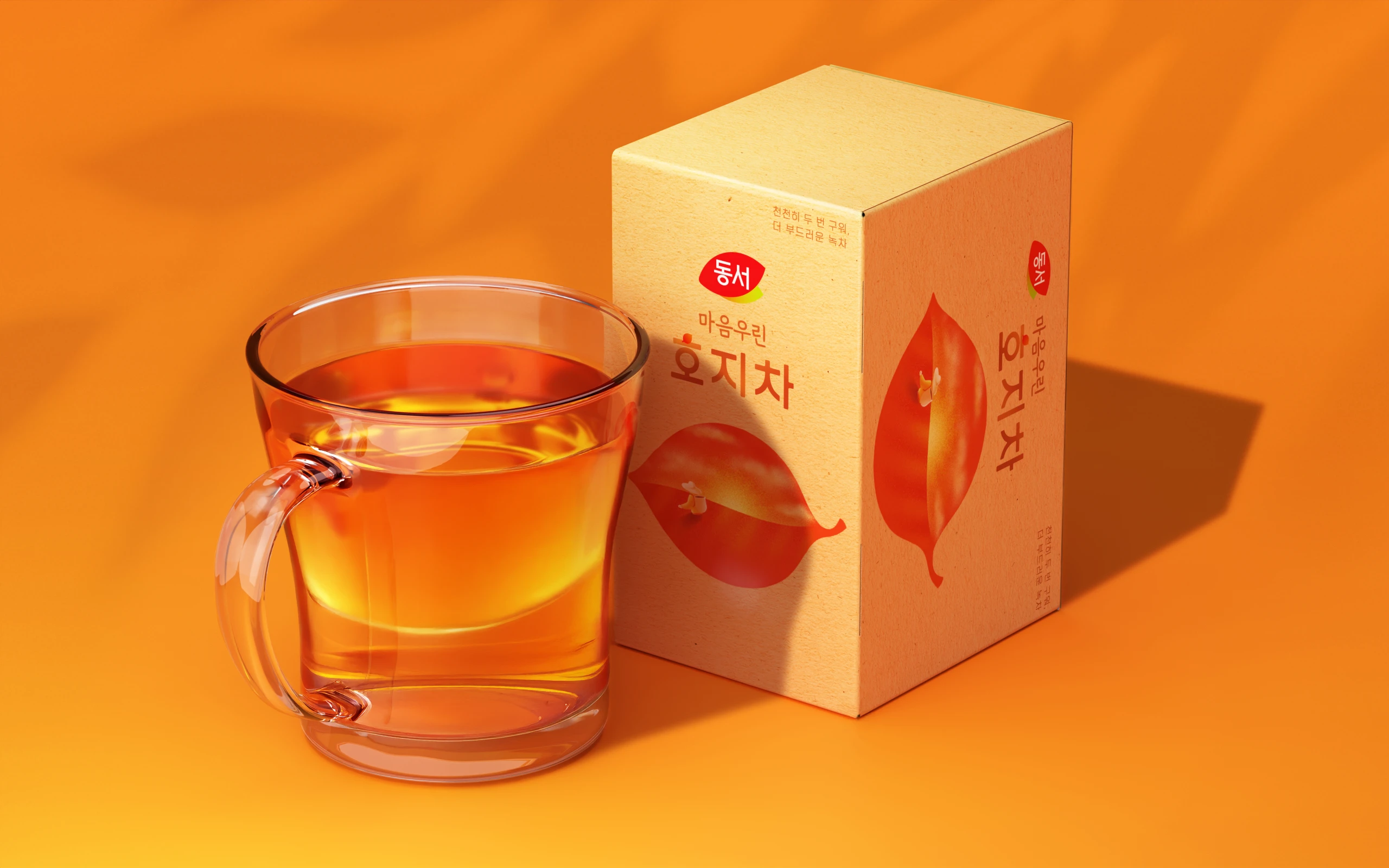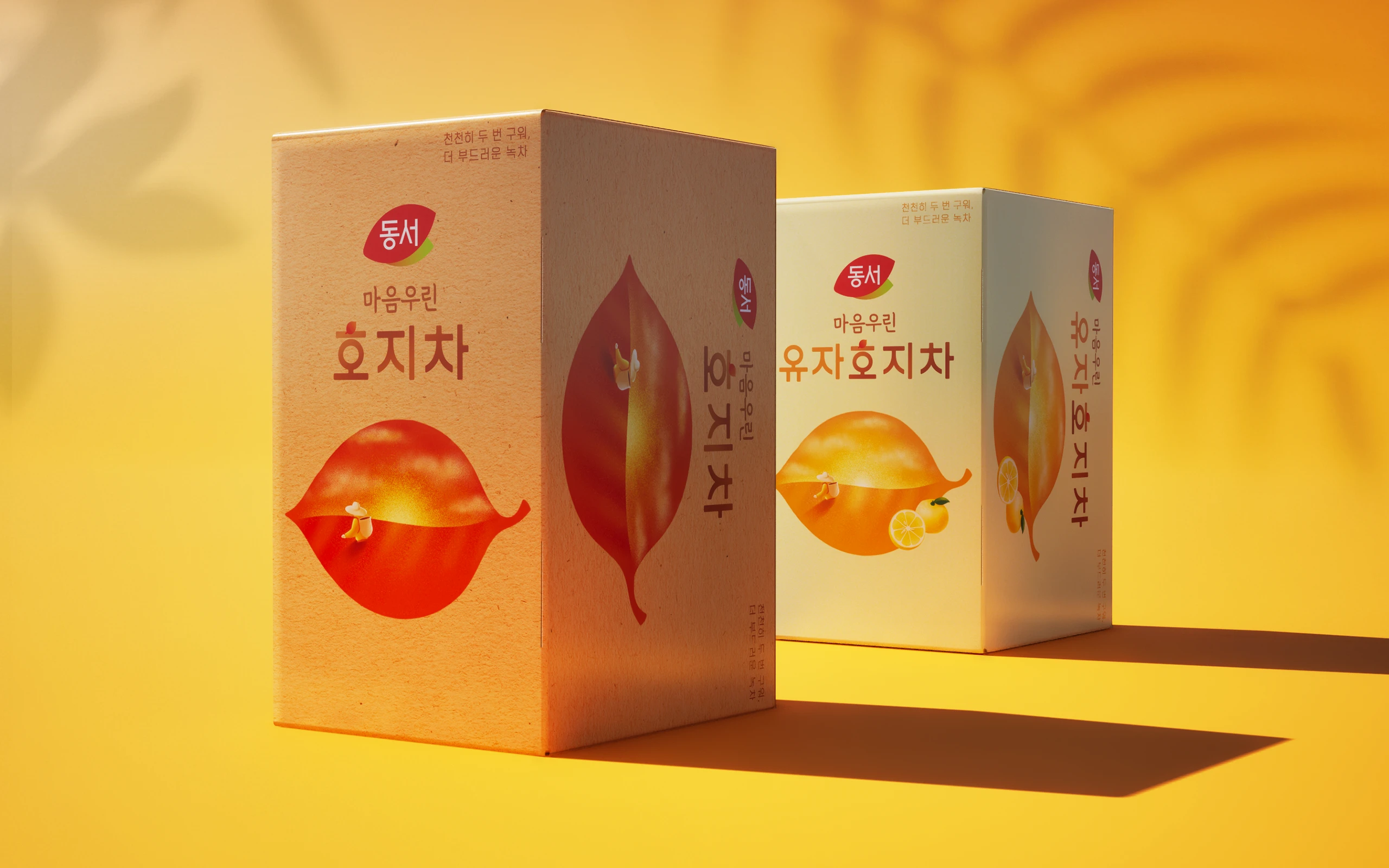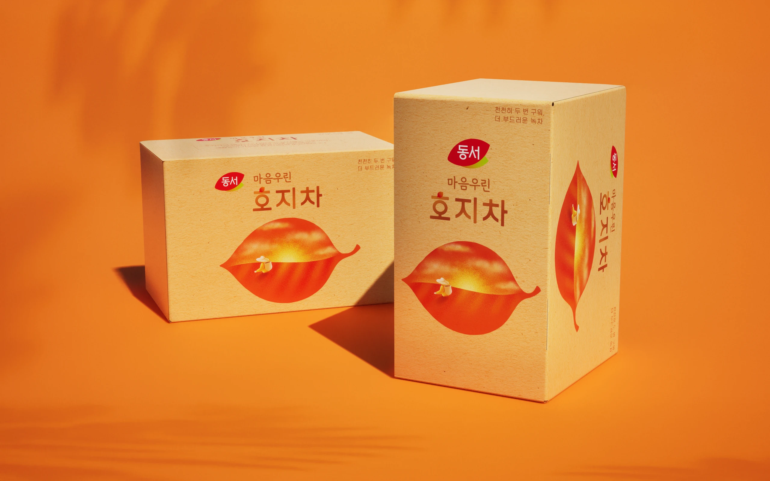 호지차와 유자호지차의 패키지 디자인 개발은 전략&컨설팅 사업부가 시장조사, 경쟁사 조사, 디자인 컨셉 개발 등 정확한 패키지 디자인 개발로 이어질 수 있도록 전략적인 지원을 진행하였습니다. 그 결과 탄생한 패키지 디자인은 해질녘 차밭에서 농부가 정성스럽게 찻잎을 따는 모습을 그려내어 동서차 브랜드만의 가치인 정성과 정성스럽게 만든 차의 가치를 표현하고 있습니다. 또한, 찻잎을 크게 배치하고 잎맥을 수평선으로 표현하여 직관적으로 편안함을 느낄 수 있고, 매장에서도 눈에 잘 띄는 유쾌한 디자인으로 완성되었습니다.