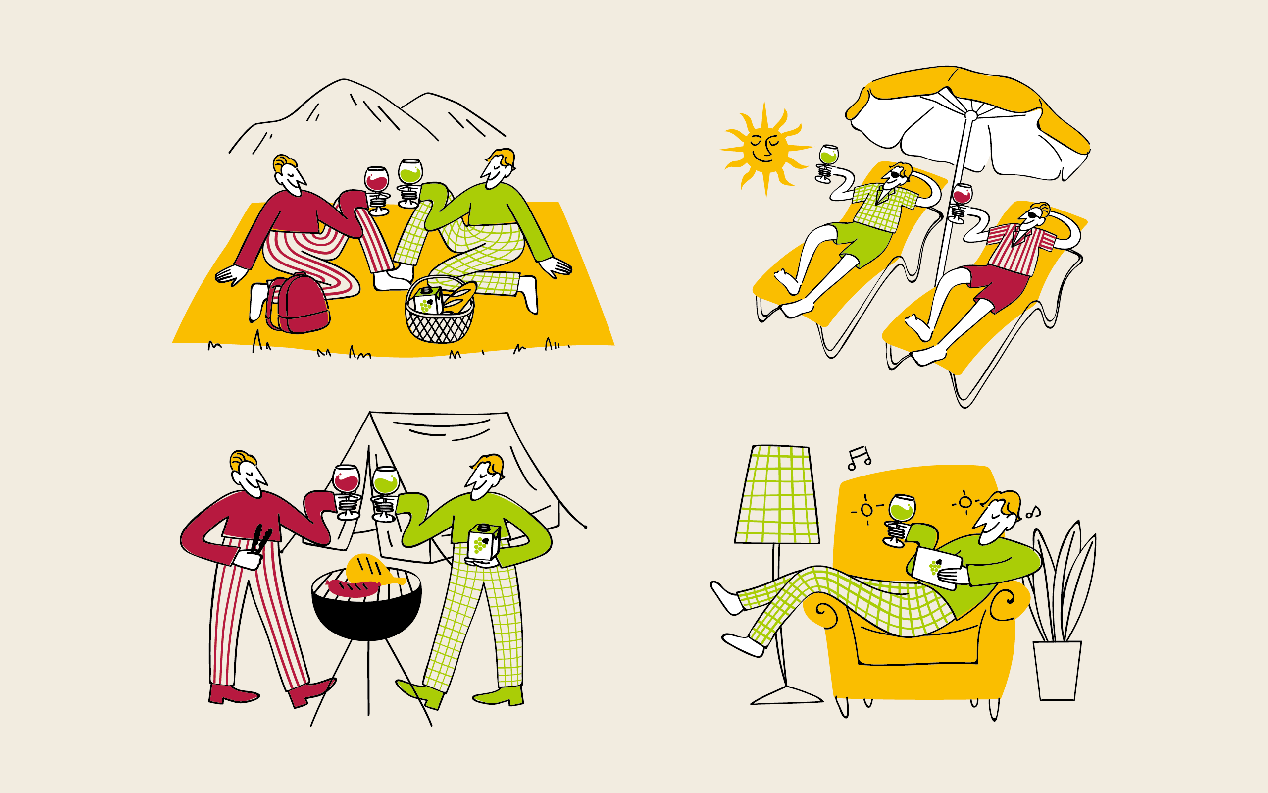내용물이 이탈리아산 정통 와인이라는 점과 상품명의 연관성을 고려해, 이탈리아인 형제가 뛰며 건배하는 이미지를 그려 넣었습니다. 이를 통해 팝하면서도 매장에서 눈에 띄는 동시에, 부담 없이 들고 다니고 싶어지는 디자인을 목표로 했습니다. 뒷면에는 다양한 상황의 일러스트를 넣어, 더욱 캐주얼하게 즐기고 싶어지는 느낌을 완성했습니다.