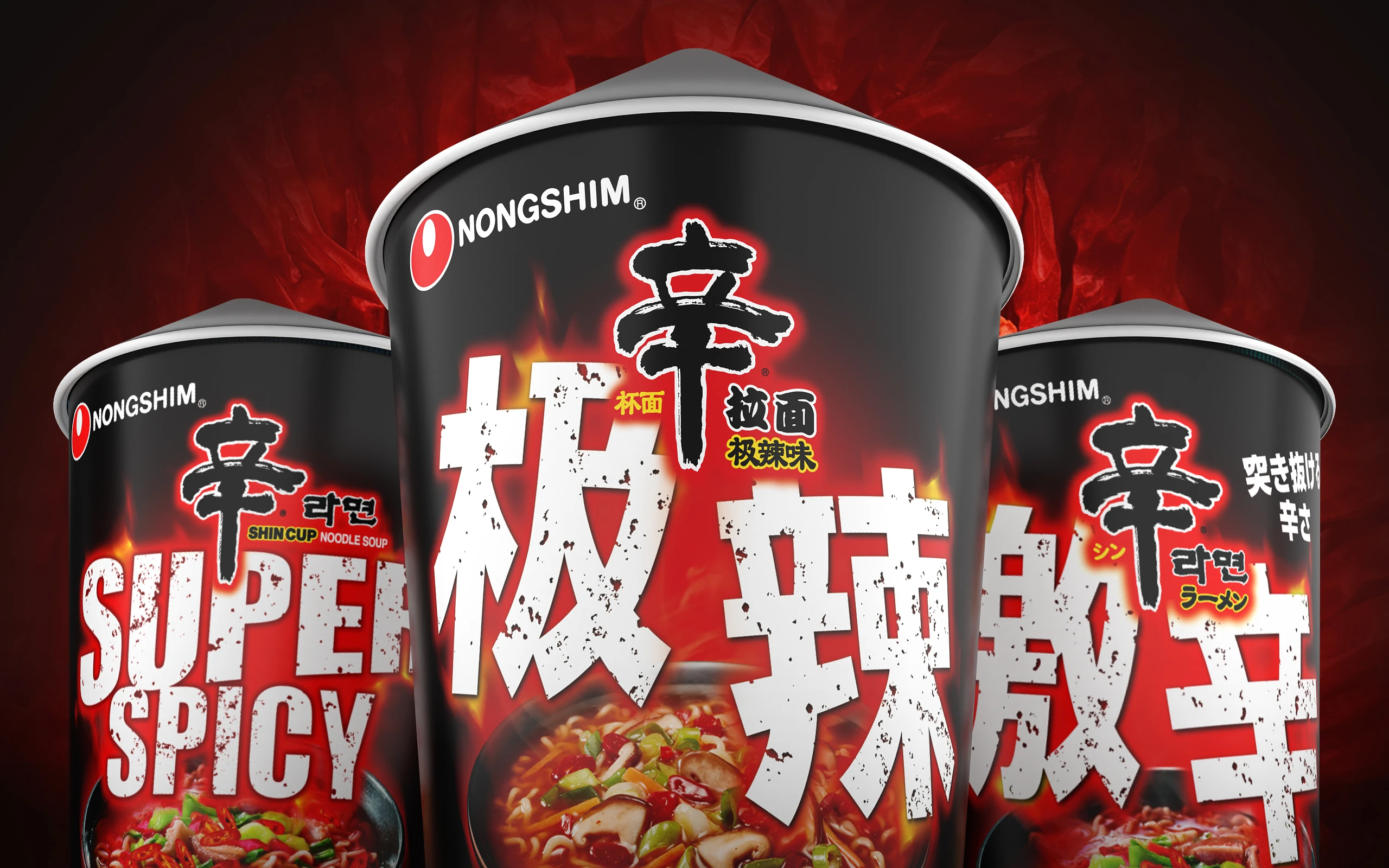기존 매운맛 라면보다 더 강렬하고 자극적인 매운맛을 표현하기 위해 블랙을 기본 컬러로 사용해 ‘불꽃’의 이미지를 로고와 시즐에 표현했다. 라면 시즐 위에 대담하게 배치된 로고는 마치 불타는 듯한 이미지로 강렬한 매운맛을 외치는 것처럼 표현했다.