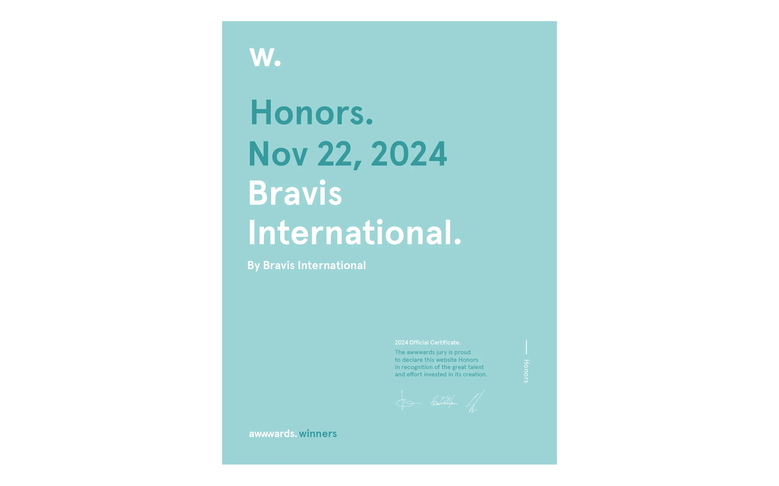 Awwwards는 2009년에 설립된, 전 세계의 우수한 웹 디자이너와 개발자, 제작사를 표창하기 위한 권위 있는 기관입니다. 브라비스가 수상한 ‘Honorable Mention’은 Awwwards가 선정한 심사위원과 일정 조건을 충족한 사용자로부터 ‘디자인’, ‘창의성’, ‘사용 편의성’, ‘콘텐츠’의 4가지 항목으로 평가받아 6.5점 이상의 점수를 획득한 사이트에 수여됩니다.