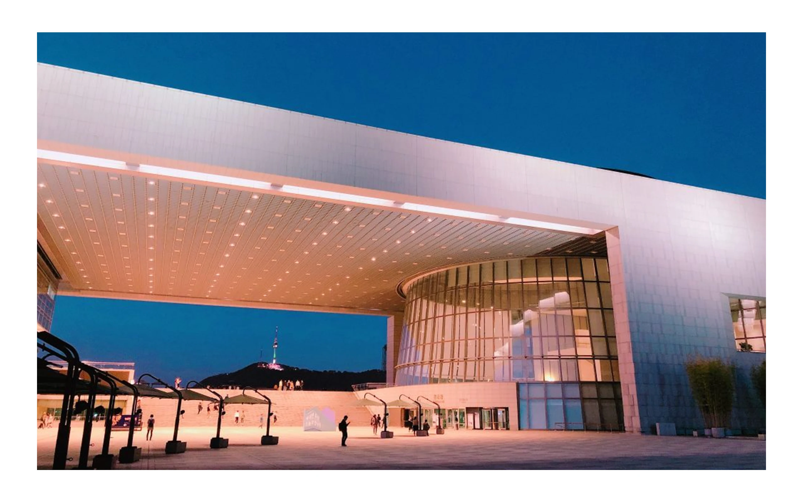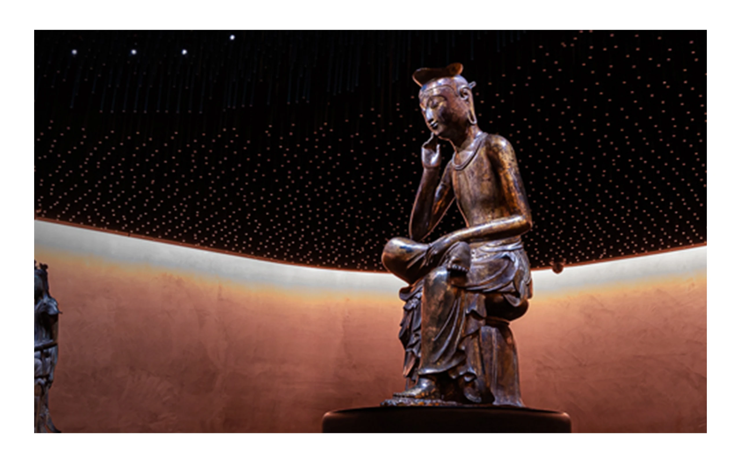 国立中央博物館は1945年の開館以来、景福宮や徳寿宮にありましたが、2005年に地下1階、地上6階、敷地面積285,990㎡の建物に移転しました。伝統建築を現代的に再解釈し、韓国の風水地理において人が住むのに理想的な場所とされる「背山臨水」を考慮して建てられており、国立中央博物館の北側には南山が、南側には漢江が位置しています。展示館の前に立つと、建物の間からソウルタワーが見えます(画像②)。韓国最大の博物館であるだけに、常設展も特別展も多いですが、最も目を引くのは国宝である半跏思惟像のみを展示する「思惟の部屋」です。この展示室は2022年に開館し、439㎡の空間にたった二点のみを展示しており、現在の時空から離れ別の次元にいるかのような抽象的で静謐な雰囲気の中で半跏思惟像に集中できます(画像③)。