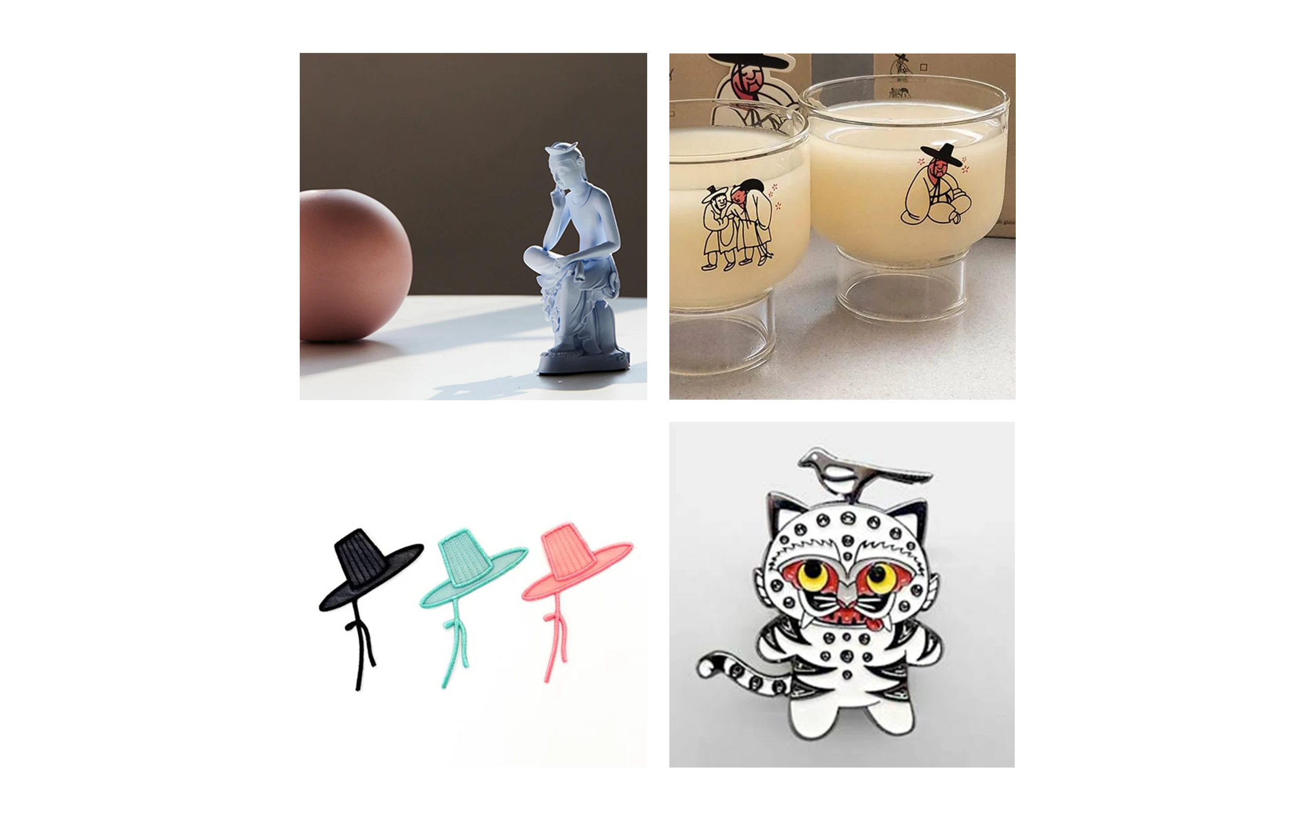 朝鮮時代に人気だった福を呼ぶカササギと厄を払う虎を一緒に描いた民画をモチーフにしたカササギと虎のバッジも発売されています(画像④)。偶然にも、Netflixで公開された人気アニメ『K-POP Demon Hunters』に、この虎雀図をモチーフにしたカササギと虎のキャラクター、そして韓国の伝統帽子である「カッ」をかぶったデーモンが登場します。K-POP Demon Huntersの世界的なヒットとともに、国立中央博物館の虎雀図バッジやカッしおりも飛ぶように売れました。韓国伝統文化への関心が、国立中央博物館の来館者数を2025年10月にはすでに500万人に押し上げたのです。