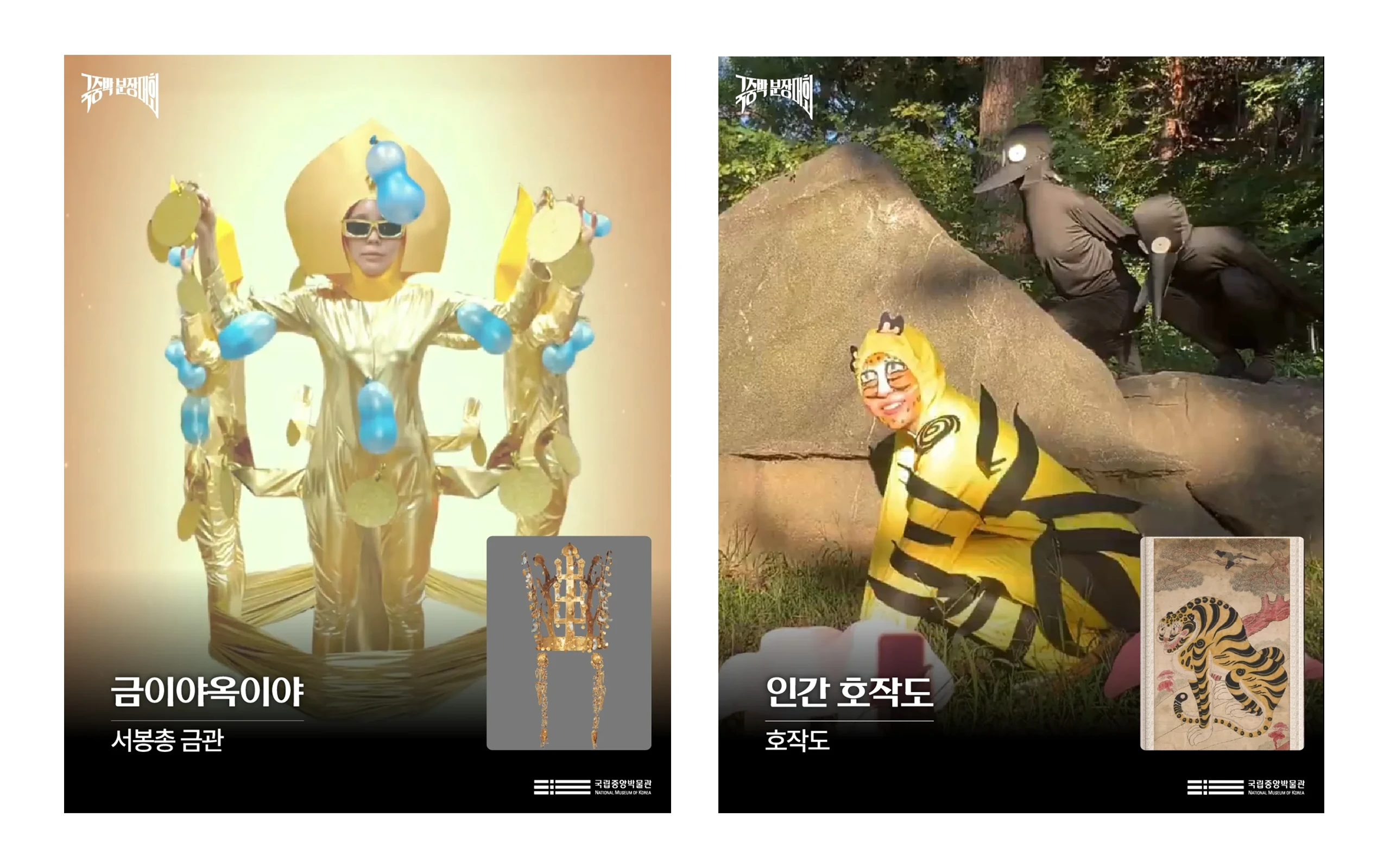国立中央博物館の館長は「博物館にも20代、30代を含む様々な世代の訪問が増えているだけに、こうした流れを継続するための多様な方策を模索していく」と述べ、『2025 国中博 扮装大会』を開催しました(画像⑤)。国立中央博物館の展示品にコスプレをする大会で、個性豊かな参加者の写真がオンラインで大きな話題となりました。優秀作品10チームを選出し表彰式を行い、イベント期間中には新羅金冠の土地・慶州で開催されるAPEC2025首脳会議を記念した新羅金冠フォトゾーン、韓国独立80周年を称える独立運動フォトゾーン、K-POP Demon Huntersのモチーフとなった虎雀図フォトゾーンを運営しました。表彰作品には金冠図や虎雀図も含まれていました。面白いことに、虎雀図に扮したチームはなんと全員が日本人だったそうです!揺れる金耳飾りを演じた大賞を受賞したチームの姿は圧巻で、その後、トーク番組にも出演するほどの人気を集めました。金耳飾りの正体は40代男性二人で、小学生の娘と国立中央博物館に頻繁に通って思い出を作るために参加したそうです。